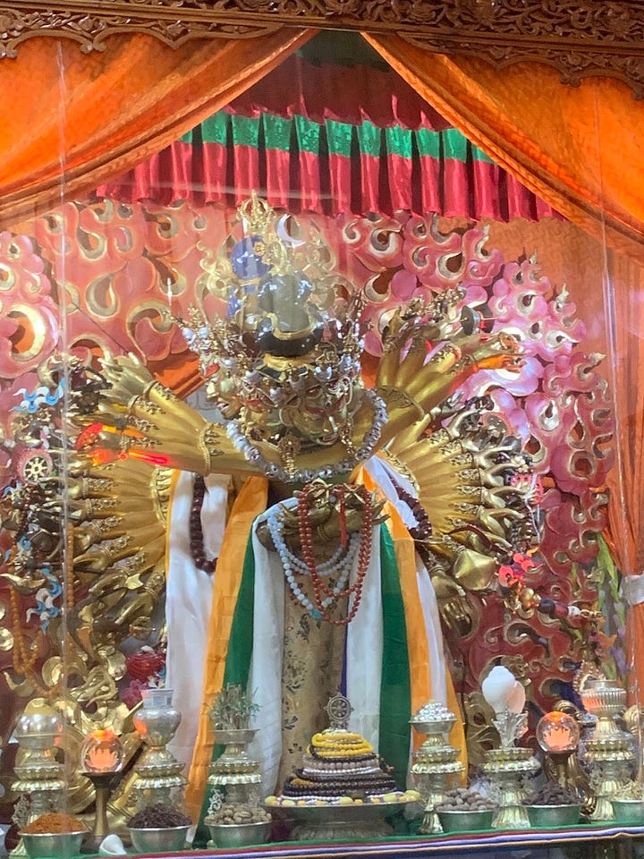 I was able to quickly transition into this new 3-month routine thanks to live Zoom teachings with Geshe Tenzin Zopa that launched at the same time I arrived just down the mountain at Tushita Retreat Center. Once a week, I’d go down to Namgyal, the main temple of His Holiness the Dalai Lama, to do my Kalachakra practice in front of this amazing holy Kalachakra/Vishvamata kaya: